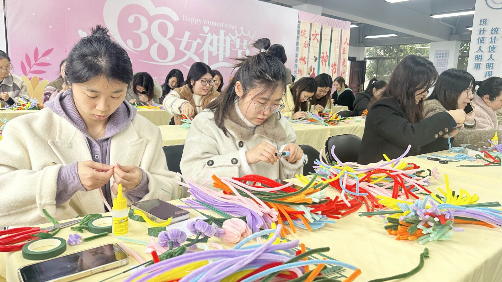 活動現(xiàn)場,五彩斑斕的花材鋪滿桌面,恰似一片夢幻的花海。女神們圍坐一處,笑意盈盈,眸光中滿是對美的向往與期待。她們巧妙搭配色彩,充分發(fā)揮創(chuàng)作靈感,精心雕琢花束的形狀。每一個動作都飽含著對美的執(zhí)著追求,每一束花都凝聚著女神們的智慧與巧思。
